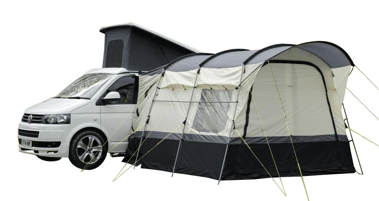 The OLPRO Loopo is a Drive Away Campervan Awning with three steel poles in a tunnel design. The Loopo is easy to pitch and sturdy when up. It is a great space for use in the day but also comes with a removable bedroom inner tent for extra sleeping space.