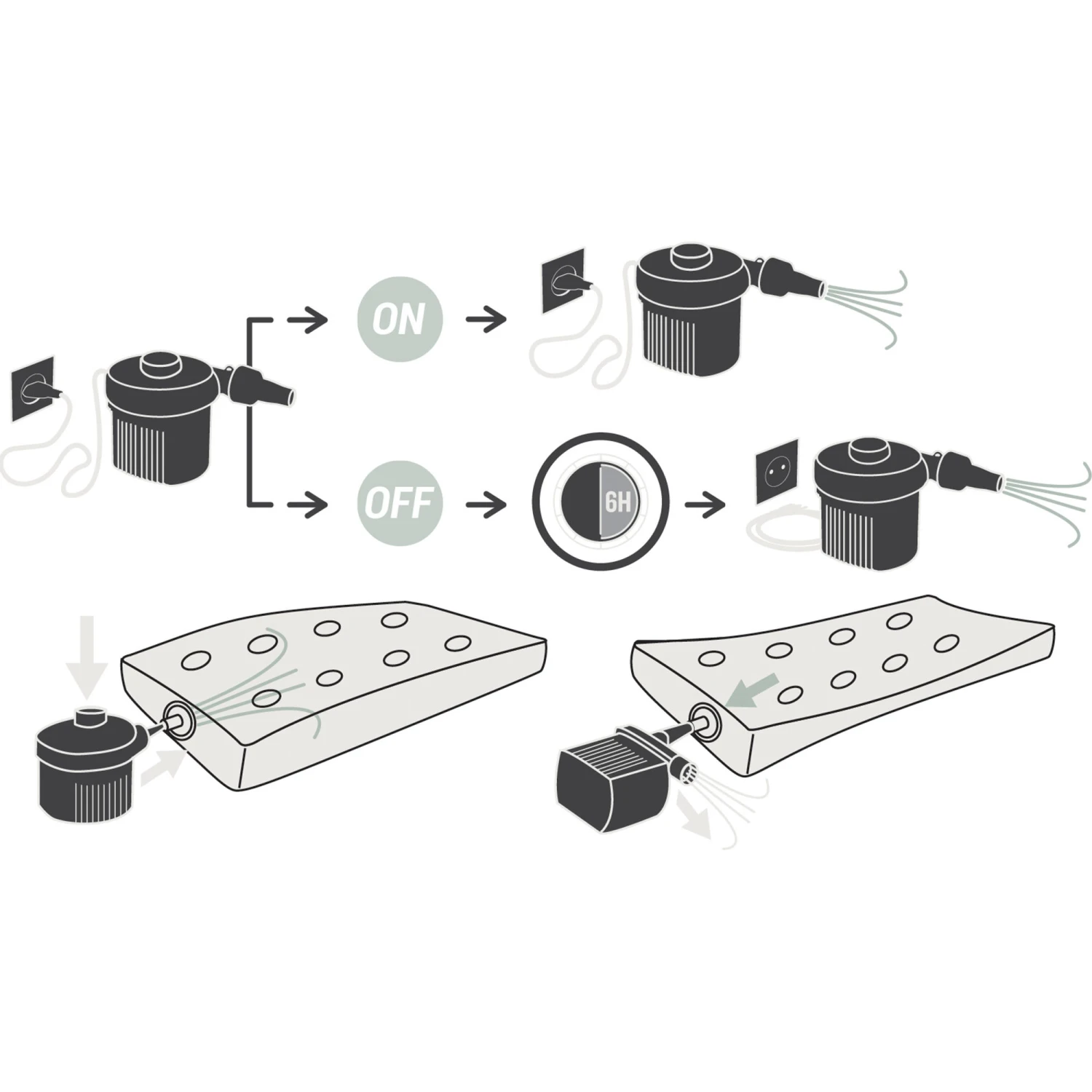 Our team of sports enthusiasts has designed this rechargeable electric pump to inflate your camping mattress in the easiest and most compact way possible.A compact electric pump for effortlessly inflating your mattress. With its rechargeable battery, it makes pitching camp easy and quick.